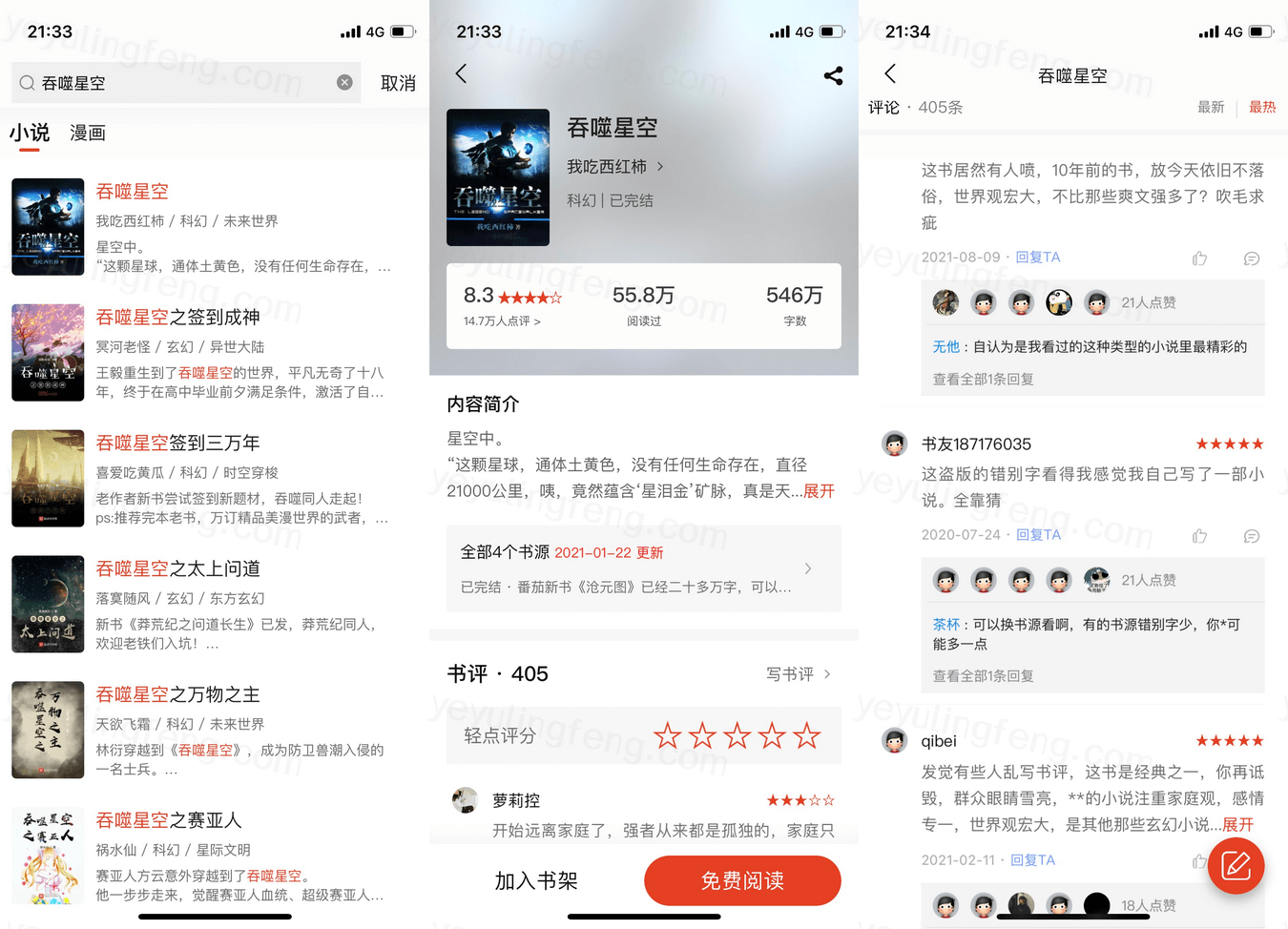 进入搜索页面就分为小说搜索和漫画搜索了,搜索出的结果点击进去就能直接加入书架或者直接阅读