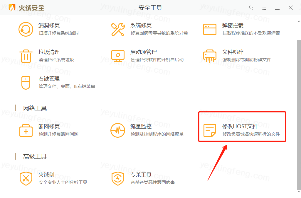 如果是安装火绒的用户可以直接在工具中一键修改hosts