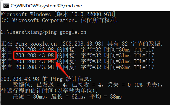 此步操作就是查找匹配当前地区Google服务的IP,虽说搜索引擎服务由于监管因素无法正常访问,但是翻译以及广告属于非敏感业务,至今还有着国内服务器节点稳定运行,不同地区分配到的服务器节点也是不一样的,所以这里直接让大家手动ping获取当前所在环境自动匹配到的节点ip