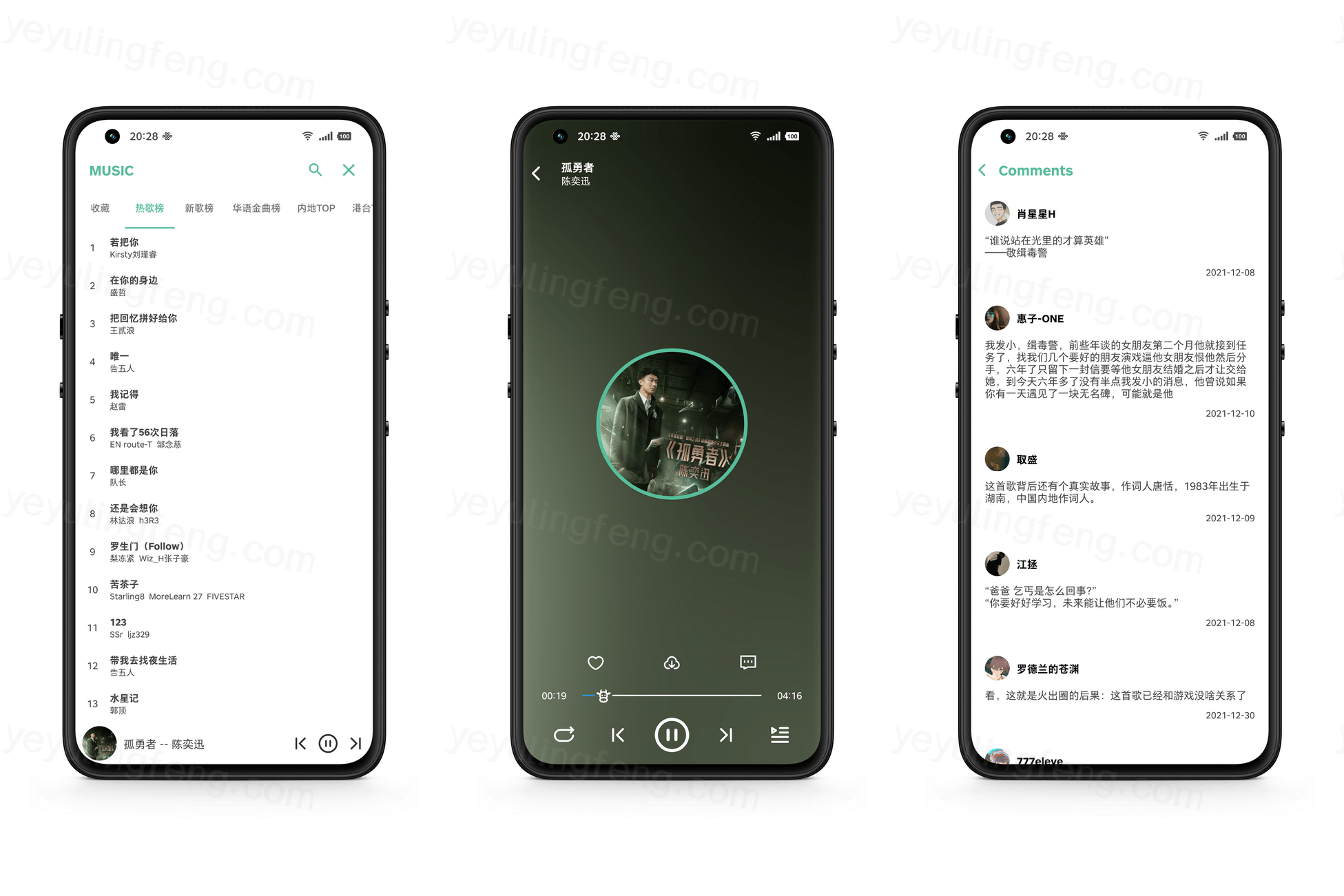 进入“音乐”版块,就能看到毫无营养的排行榜,不过好在支持搜索,进入音乐播放界面还支持评论和下载,评论都是爬取的官方的数据,只能看不能评论,至于音质么听个响而以不要太在意细节,支持一键下载至本地