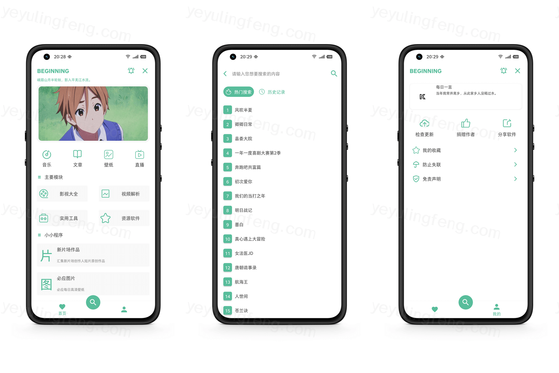 App完全免费,并且无任何广告,内置数十种实用功能,包括音乐、文章、壁纸、直播、影视、视频解析、实用工具等。