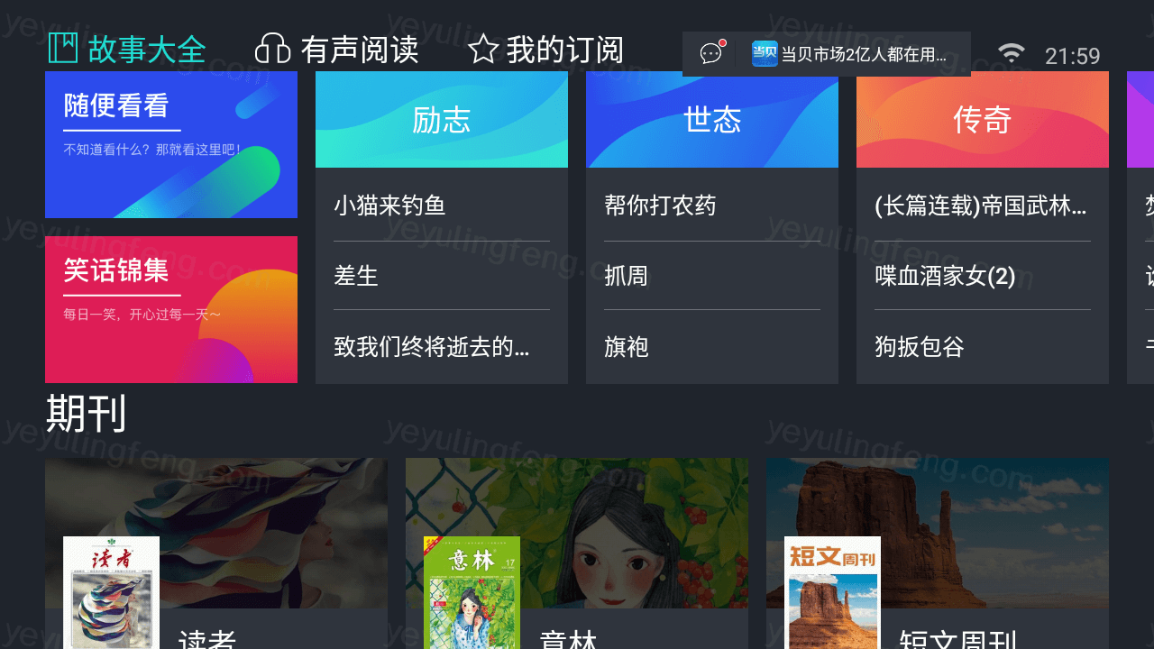 熊猫阅读TV是专为电视打造的阅读应用,安装后就能看一些期刊杂质,还能听书,内容广泛界面干净