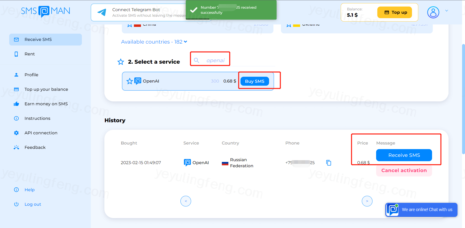 接码平台老夜用的是SMS-MAN,这个为收费服务,市面上各种免费的接码平台大部分都是虚拟号码,在ChatGPT注册验证中并不能使用