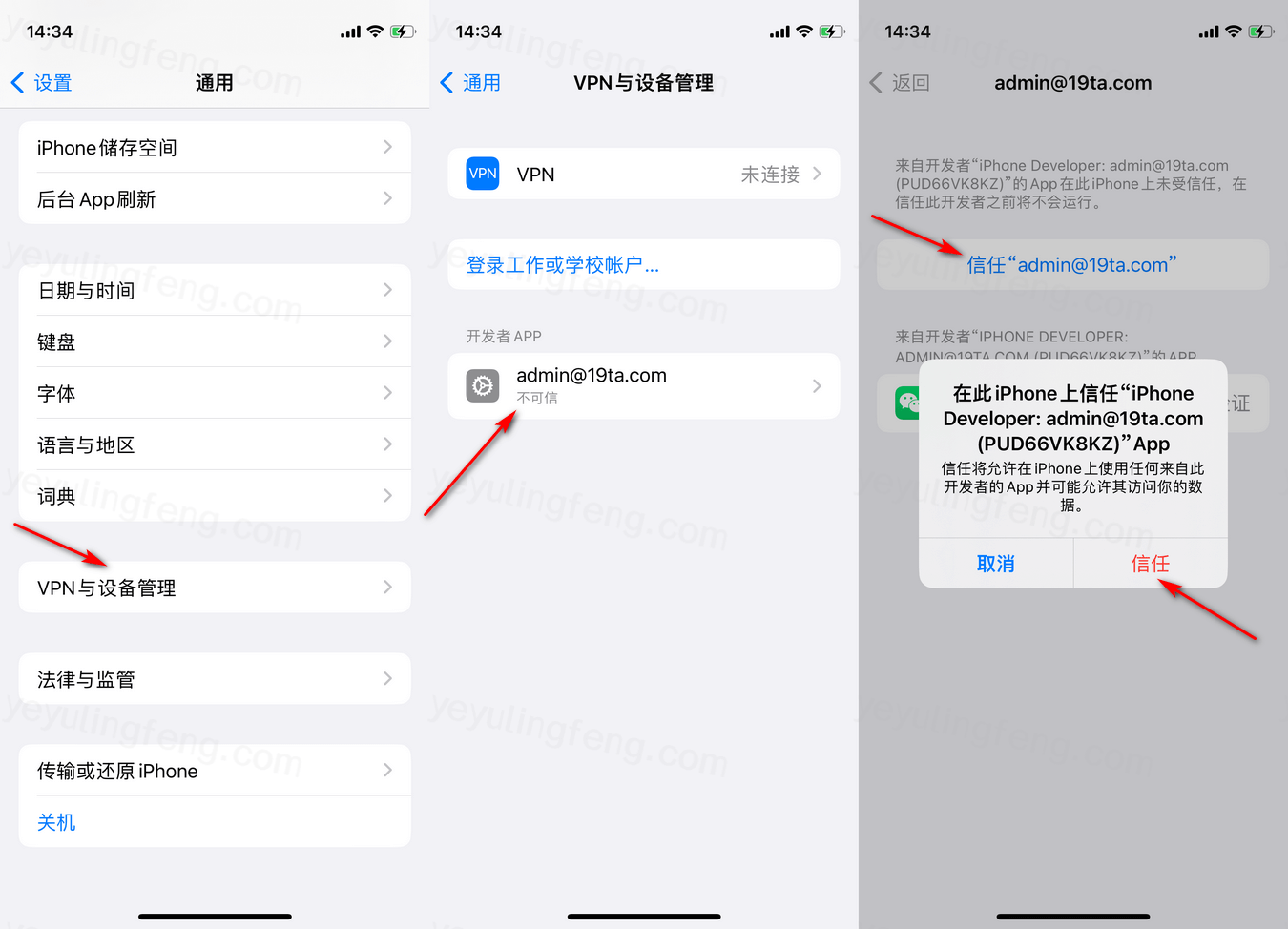 然后我们拿起手机一探究竟,点开又是一个白花花的弹窗,最重要的一步来了,按照下图指示信任即可