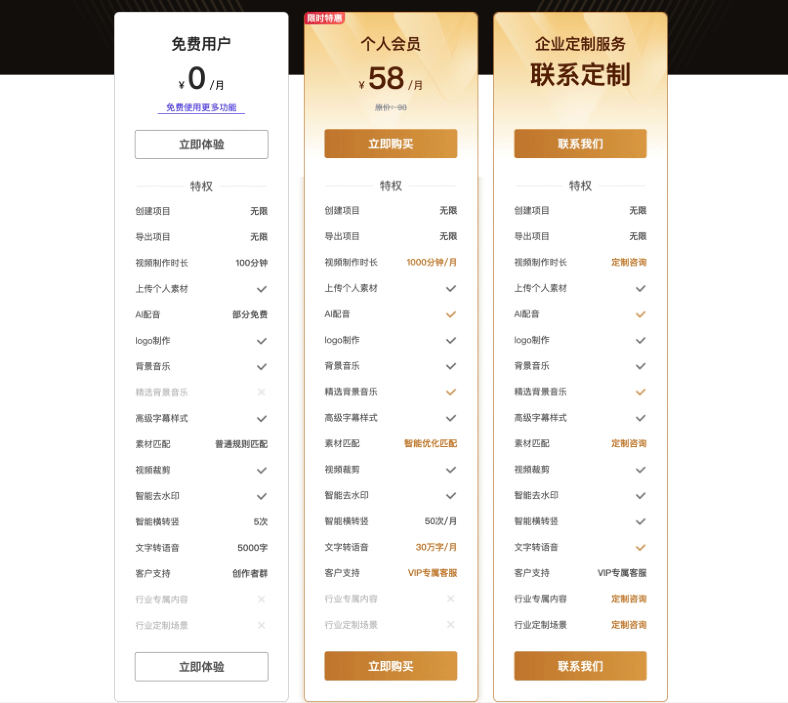 目前一帧秒创免费使用是完全没问题的,当然会员可享受更多权益,具体区别可看下图: