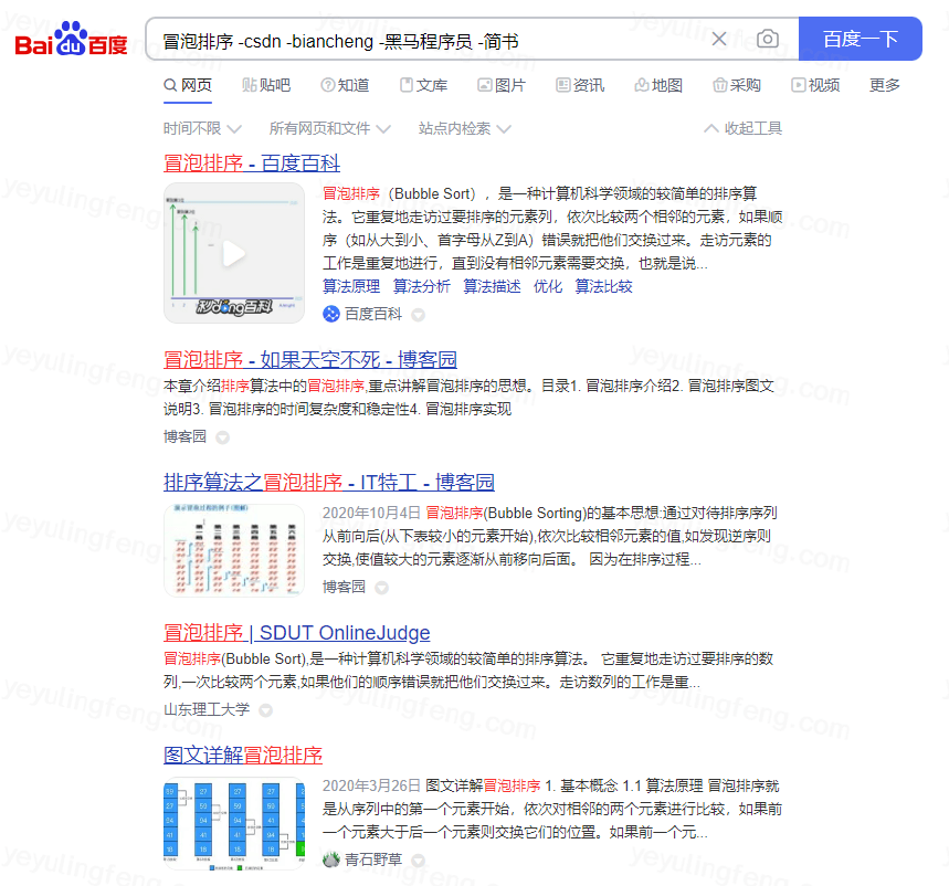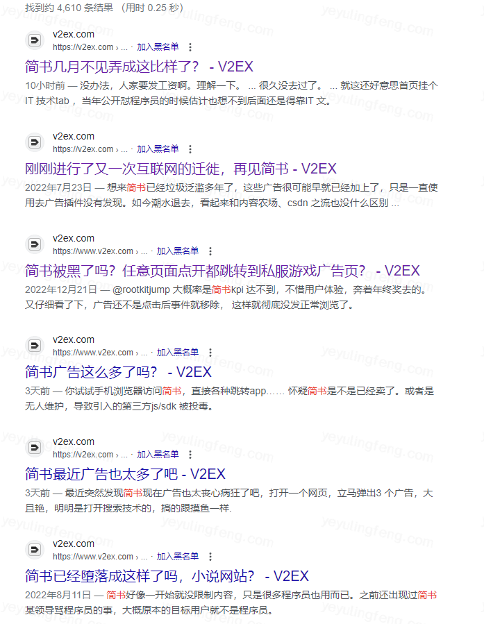 如果用搜索引擎像过滤掉CSDN、简书的内容同样很简单,可以在输入搜索词时加上’ -csdn’或者’ -简书’就可以实现了(记得加空格),过滤其他网站同理。进阶一点的操作就是使用uBlackList拓展插件来屏蔽,往期老夜有在夜雨聆风网站介绍过