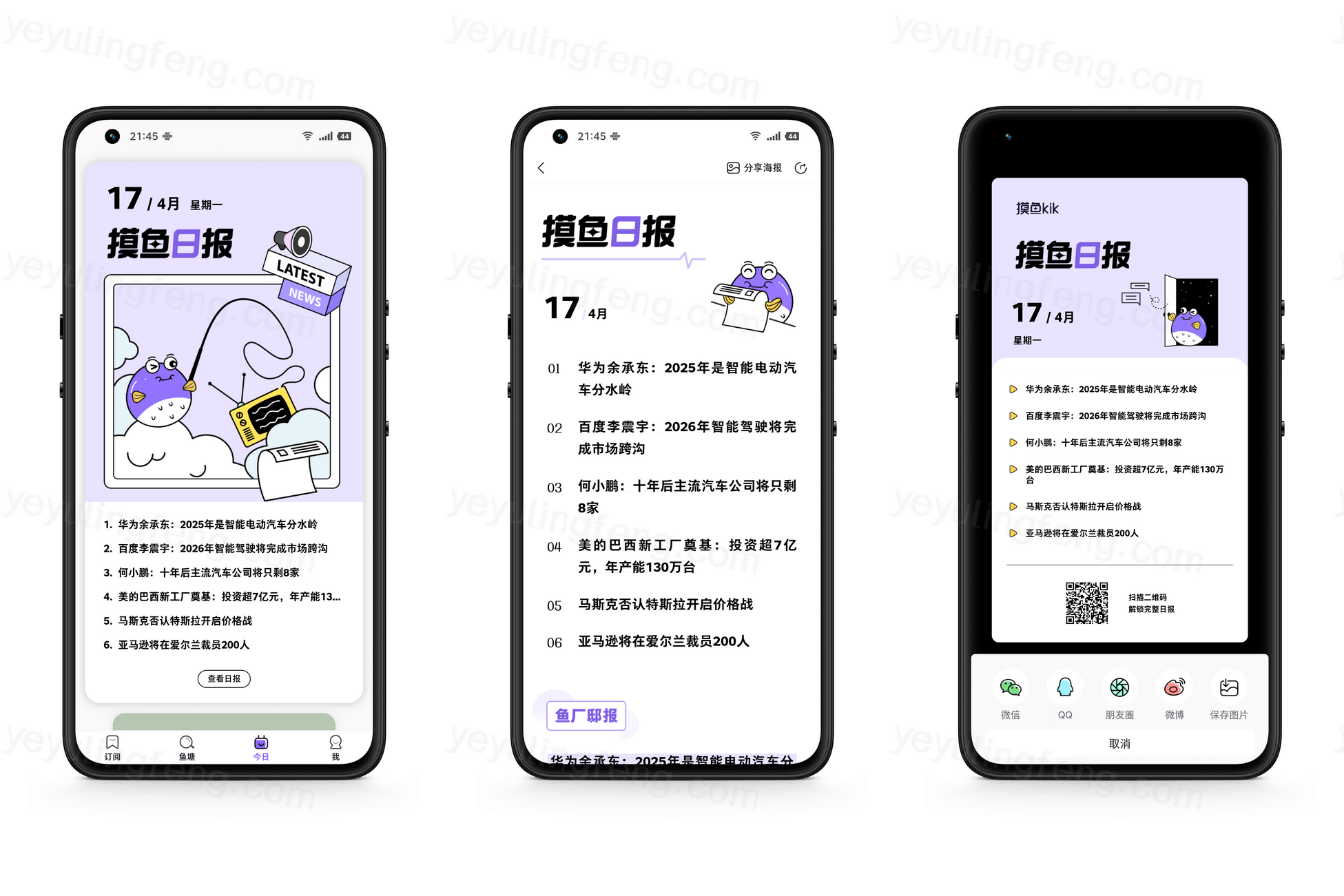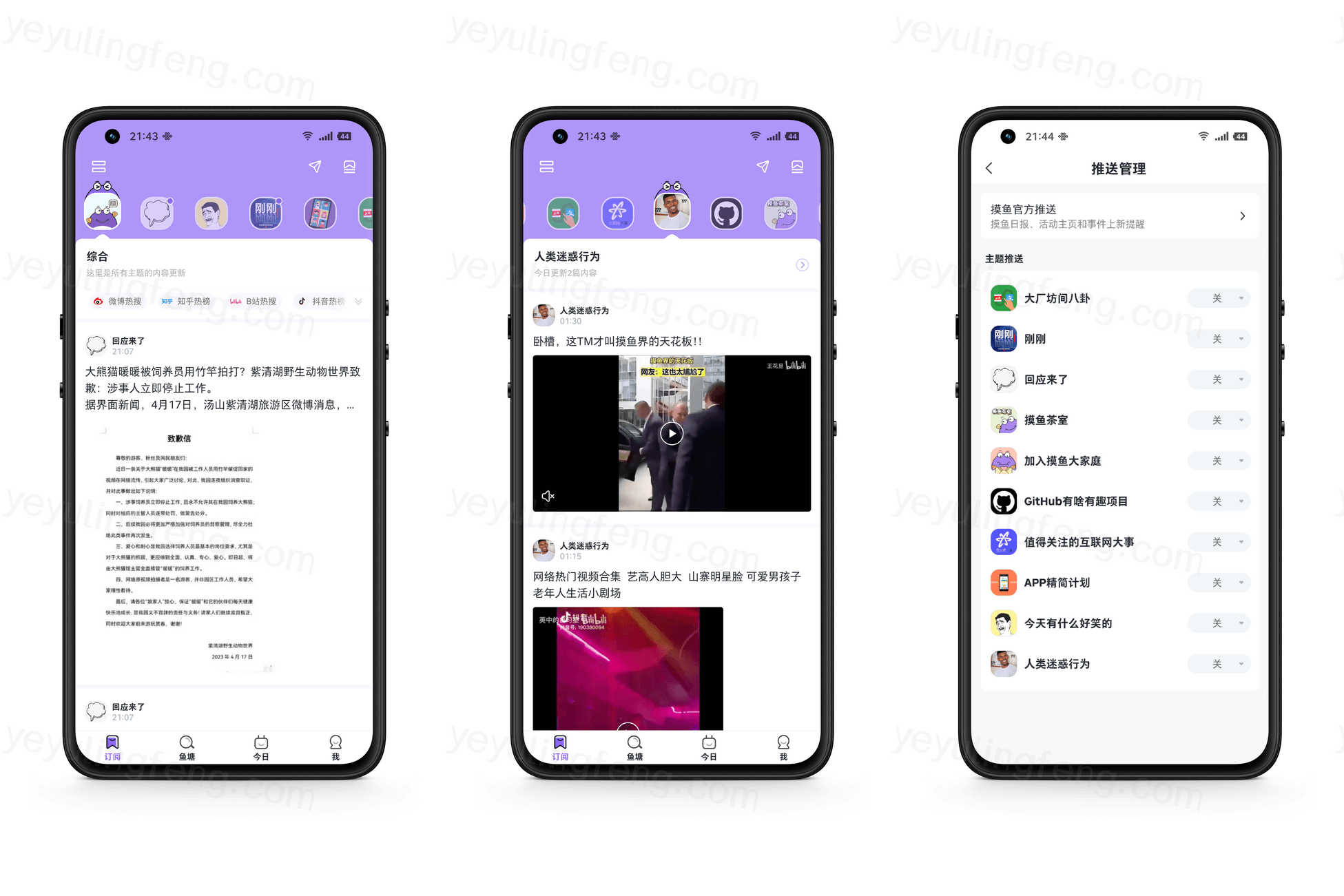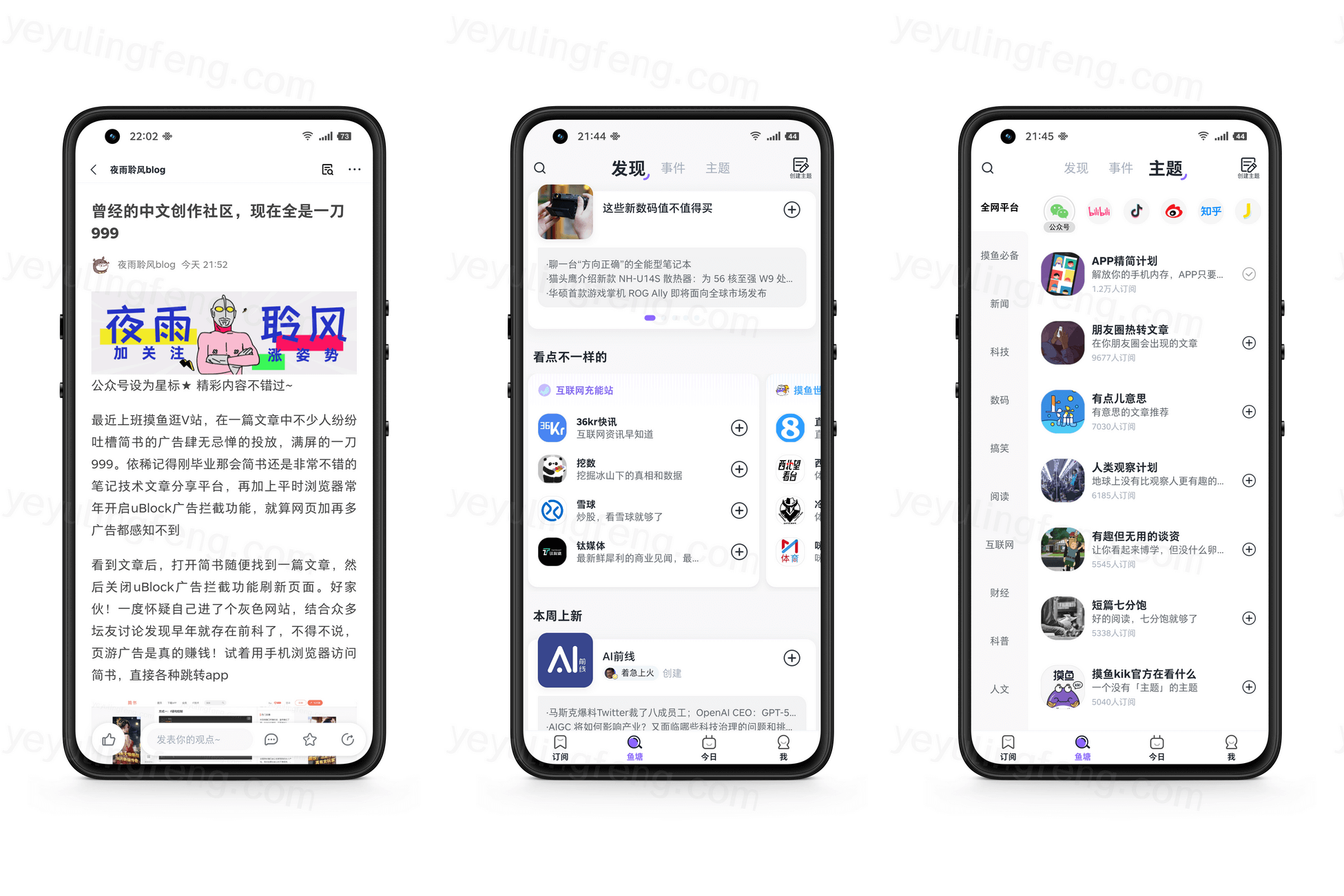 各大媒体的订阅基本上都覆盖齐全了,科技、生活、情感众多分类都应用尽有,将喜欢的内容订阅,不在受所谓的算法推送打扰,所有的内容都是自己喜欢的,如果内容不够看了继续去鱼塘发掘新的主题