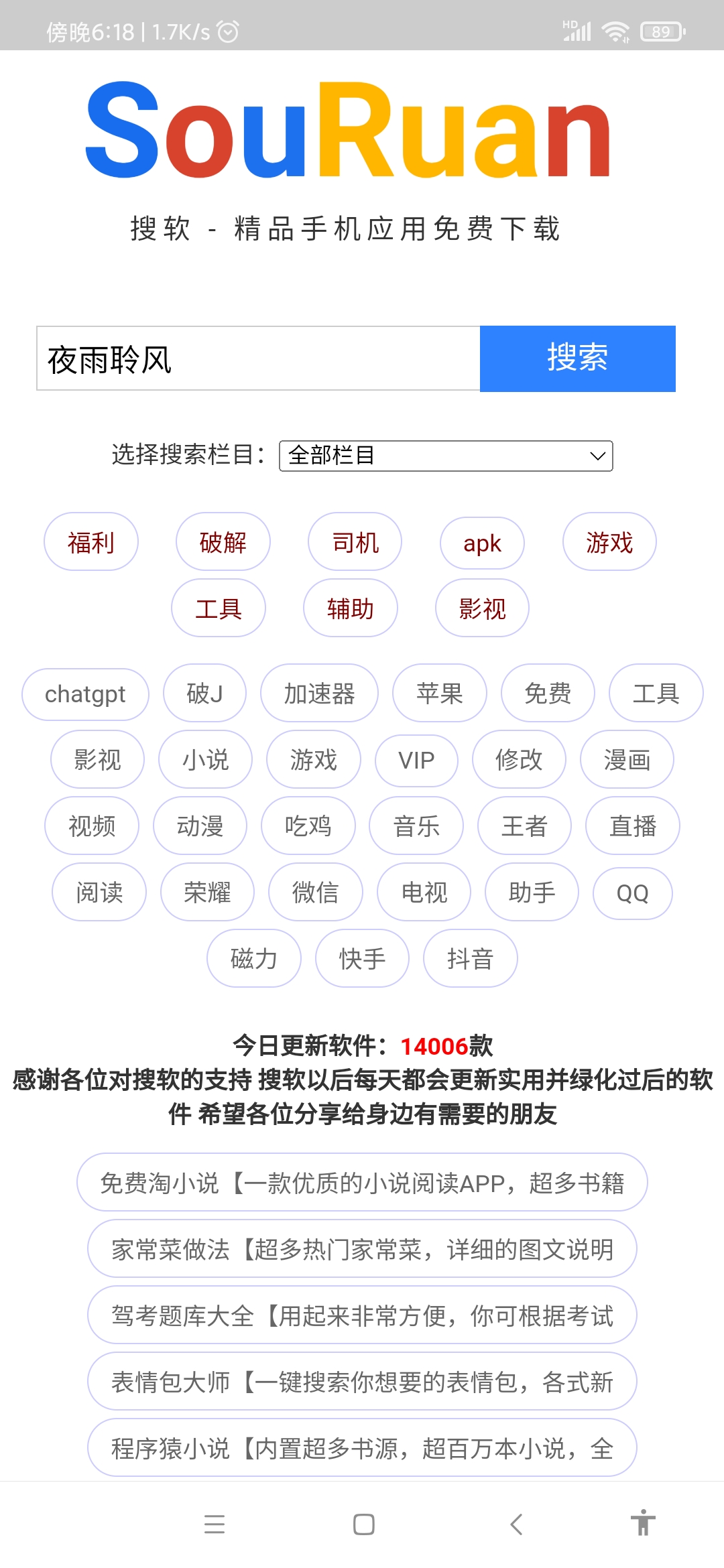 先说首页,提供一个搜索框然后下方有下拉菜单你可以精确的搜索某一个栏目里面的东西,其次栏目下面是一些方便各位搜索的词语,挑的是这个软件受众人群经常搜索的词,再往下就是搜软他今日具体更新了什么他展现了100个左右在首页