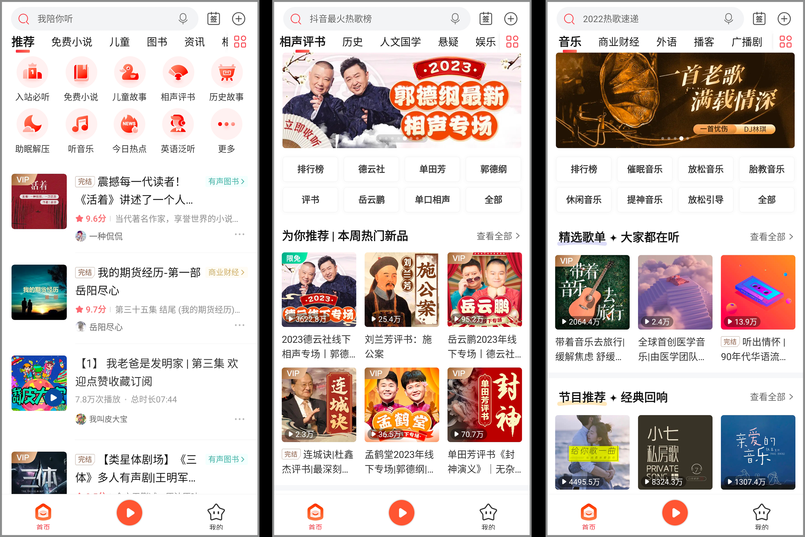 作为一款有声类听书神器,不仅支持听小说,还为用户提供了各种有声节目,包括:相声评书、人文国学、娱乐资讯、儿童教育、情感生活、健康养生、脱口秀、广播剧等娱乐类节目,这么多类型的节目可以很好的满足您的有声阅读需求。