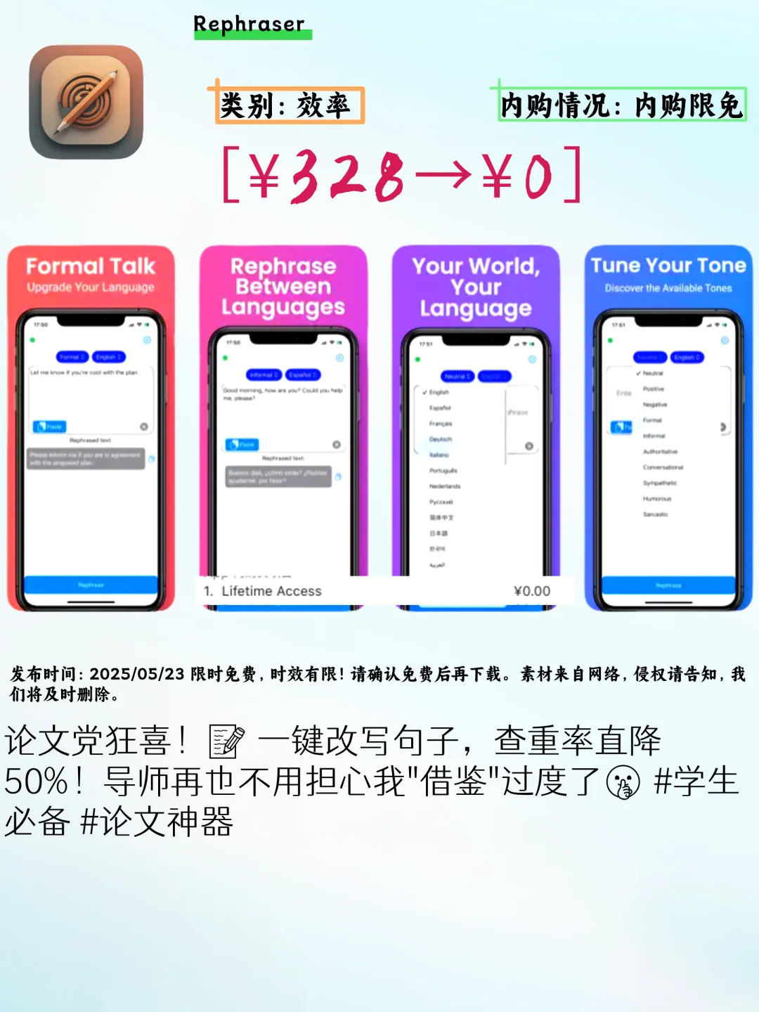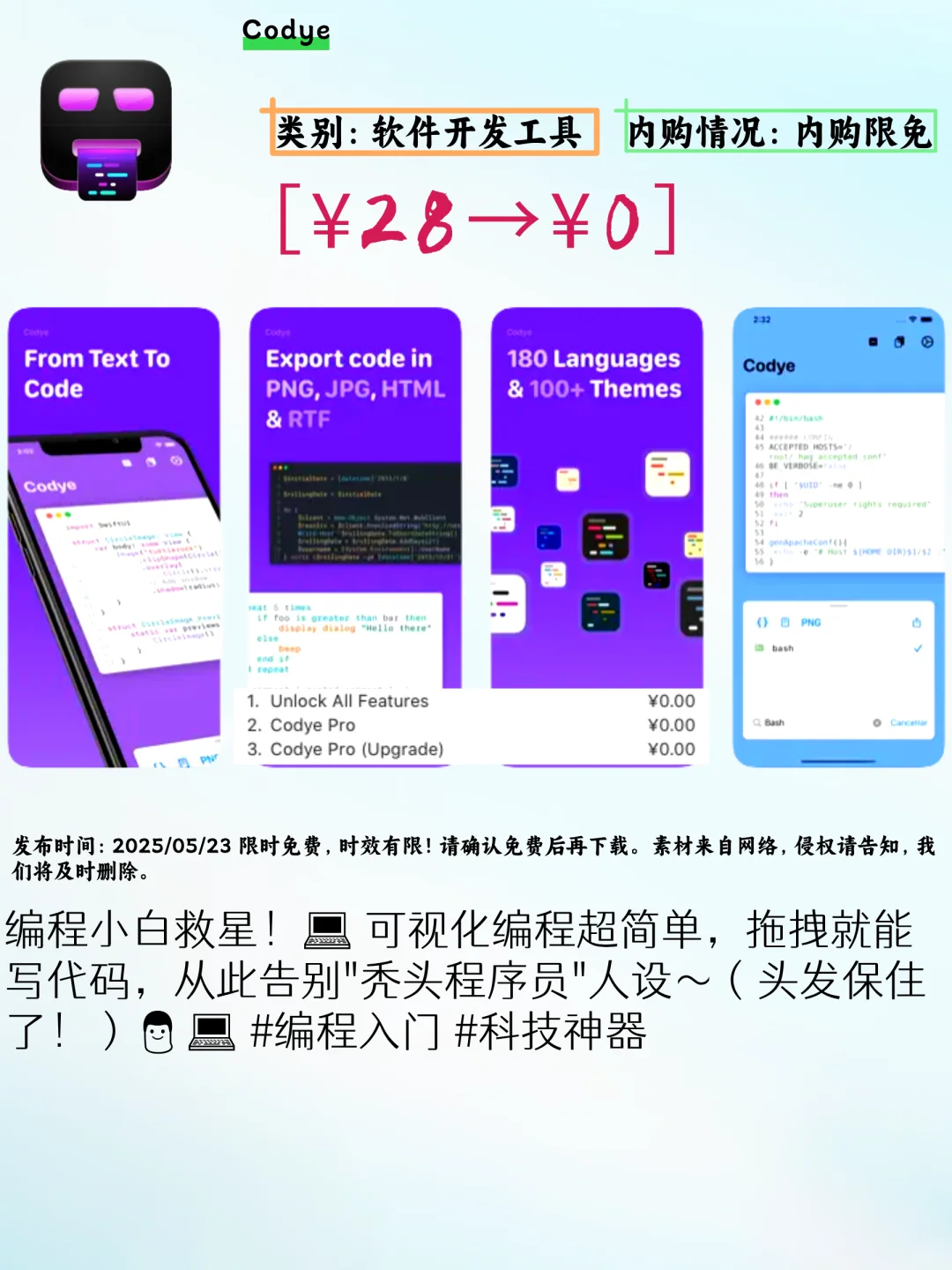 宝子们!限免羊毛又来啦~这次挖到的APP一个比一个绝,手慢无警告⚠️\n1️⃣ Codye\n编程小白救星!💻 可视化编程超简单,拖拽就能写代码,从此告别\”秃头程序员\”人设~(头发保住了!)👨💻 #编程入门 #科技神器\n2️⃣ Rephraser\n论文党狂喜!📝 一键改写句子,查重率直降50%!导师再也不用担心我\”借鉴\”过度了🤫 #学生必备 #论文神器\n3️⃣ ColorFinder\n色盲设计师福音!🎨 拍照秒识Pantone色号,从此配色不再翻车!甲方爸爸都夸我审美开挂了✨ #设计神器 #配色攻略\n4️⃣ MOODLAPSE\n情绪过山车记录仪!🎢 每天30秒视频记录心情,回头看像在看狗血连续剧…(我昨天为啥哭来着?)😭 #心理疗愈 #生活记录\n5️⃣ SpaghettiAR\n厨房杀手逆袭!🍝 AR教做意大利面,手把手到摆盘~从此朋友圈厨神就是我!(泡面党慎入)👩🍳 #下厨必备 #AR黑科技\n⚠️限免不等人!速冲App Store!错过等一年!\n(部分含内购,基础功能完全够用!)\n💡Tips:限免APP随时恢复原价,手慢无!速戳⏬收藏⭐防迷路,关🐷我每天更新更多羊毛攻略🐑~\n💌小贴士:每日限免清单可蹲「今日限免」APP\n#宝藏app#宝藏app分享#宝藏app推荐#实用app#实用app#实用app推荐#实用app安利#iOS限免App#宝藏APP#apple#appstore#宝藏APP#数码宝藏#科技羊毛#数码玩家#宝藏软件#APP推荐#限时免费#APP推荐#实用工具#种草清单#数码好物#APP种草#学生党必备#iOS限免#APP推荐#数码种草#学生党必看#APP推荐#数码种草#打工人必备#APP种草#数码好物#学生党福利\nPS:那个AR做饭APP…试做三次后我家厨房还健在(奇迹)🙏🔥