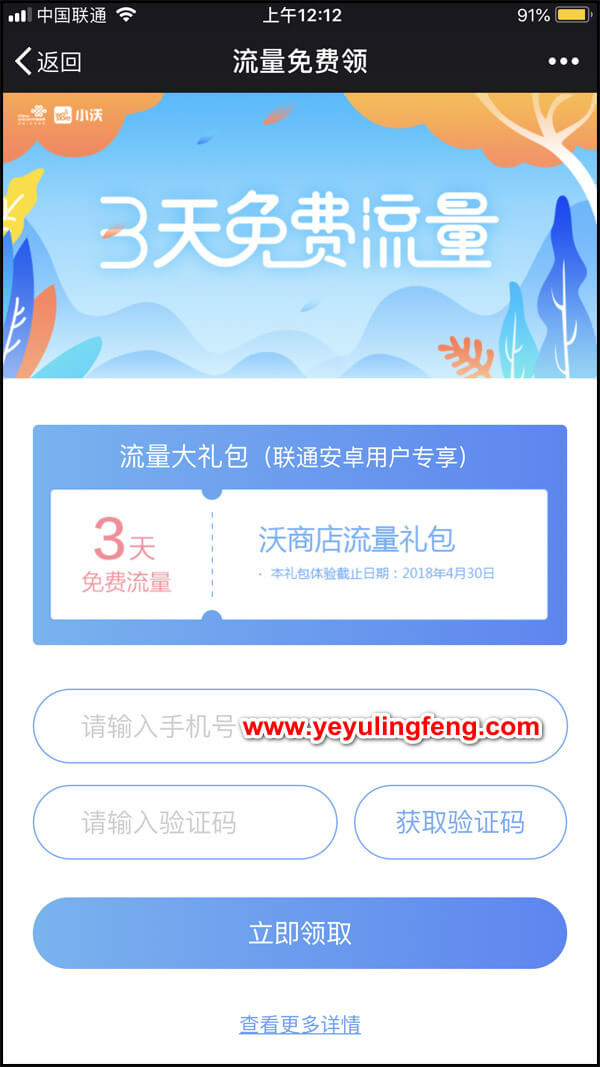 进入活动页面后填写自己的手机号码,一定要是中国联通的手机号码才可以。接受验证码后方可领取,三天无限流量还是挺爽的!
