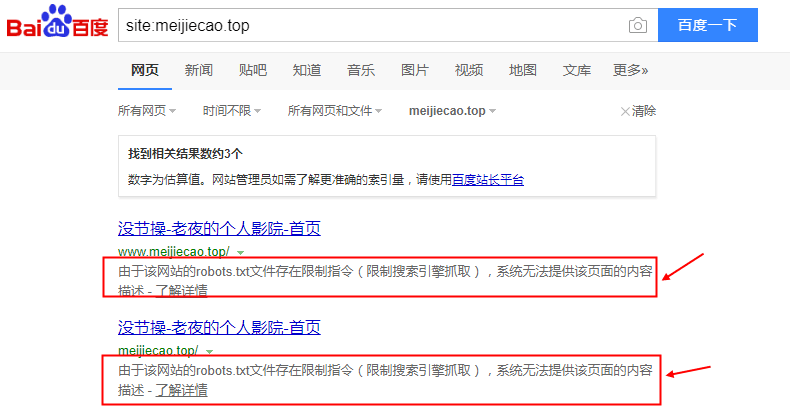 推荐以上方法双管齐下全部用上,确认以上设置无误后,每天在搜索引擎中搜索site:域名就可以查看结果了。出现下图中的信息就说明设置成功,再也不怕有外来者从搜索引擎偷渡过来了!(复制你奶奶个腿,本文是老夜写的,改了名字冒充老夜,要脸吗)