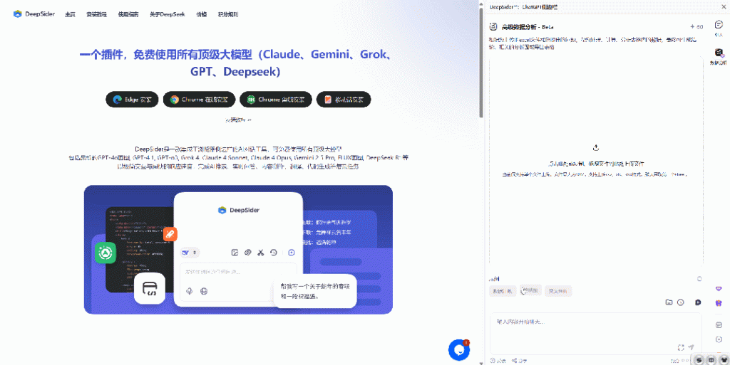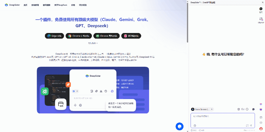 装完插件后,点击浏览器右上角的DeepSider图标,就能打开侧边栏,选择你所需的AI模型,与它进行对话了。