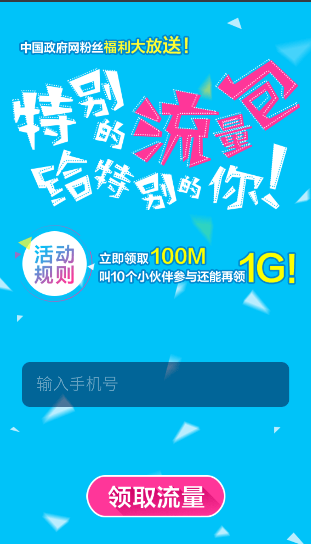 新的撸流量活动又来了,虽然之前站内分享过不少运营商的活动,但是基本上都是联通家的福利,另外两家均是小打小闹实在是有点抠门,平时那些小皮毛撸的也没意思老夜也就懒得分享出来。这次是政府的微信公众号送流量,绝对的靠谱,除了关注就送100M外,邀请好友领取流量也能获取流量,互利互惠何乐而不为!
