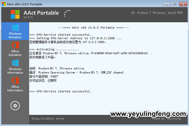 该程序无需任何版本的 .NET Framework 支持,即可轻松激活Windows Vista、Windows 7、Windows 8/8.1、Windows 10、Server 2008/2008 R2、2012/2012 R2、Office 2010/2013/2016 VL 版本。