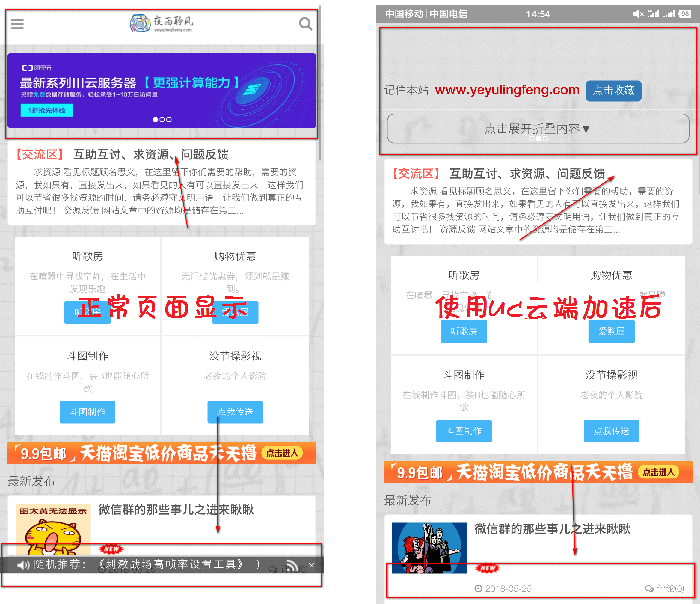 归根结底就是UC浏览器默认启用了云端加速功能,当年还算是比较惊艳的一项功能了,对于如今走到哪儿都是无线网来说,此功能就显得比较鸡肋了,至于云端加速原理也是十分简单也就是多了一个步骤,原先的网页经过UC的服务器进行压缩后才传递到用户的手机上,除了省流量以外,图片质量以及页面多多少少都会有所下降,甚至出现上图中的版面折叠问题。