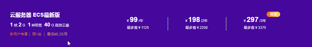 正好最近阿里云活动让大家赶上了,这里就分享给大家。原价300多一年的服务器活动时间内新用户99即可拿下,买的时间越长优惠幅度更大。活动仅限新用户,老用户们想入手可以拿家人朋友的账号来撸一波了,目前本站就是运行在阿里云的服务器上,稳定性还是有目共睹的,想长期规划的建议直接入手阿里云。