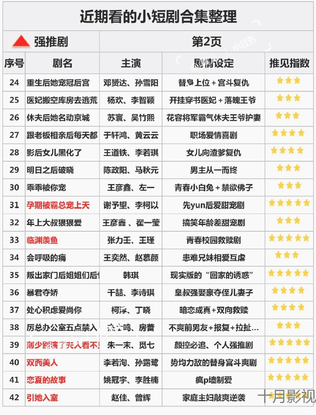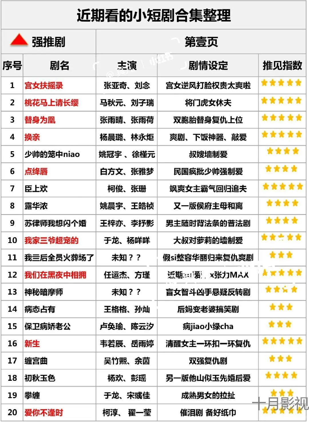 本文最后更新于2025-12-08,某些文章具有时效性,若有错误或已失效,请在下方留言或联系老夜。 “网友力荐短剧TOP榜,你追过哪些?” 自己下班业余做的表格,总结了一下近期看过的上头小短剧,按照看剧时间先后顺序写的…… 不得不说近期古装短剧吃得太好了,《 》《 》《 》都敲好看,以至于现在剧荒当中……感觉起点高高得…… 集美们,还有什么可以追的剧……已经把该看的能看的都刷一遍啦!哈哈……还有啥剧可以看看? #宫女扶摇录 #替身为凰 #桃花马上请长缨 #短剧 #短剧热播 #热门短剧 #一起追剧吧 #剧荒了看什么 #剧荒推荐