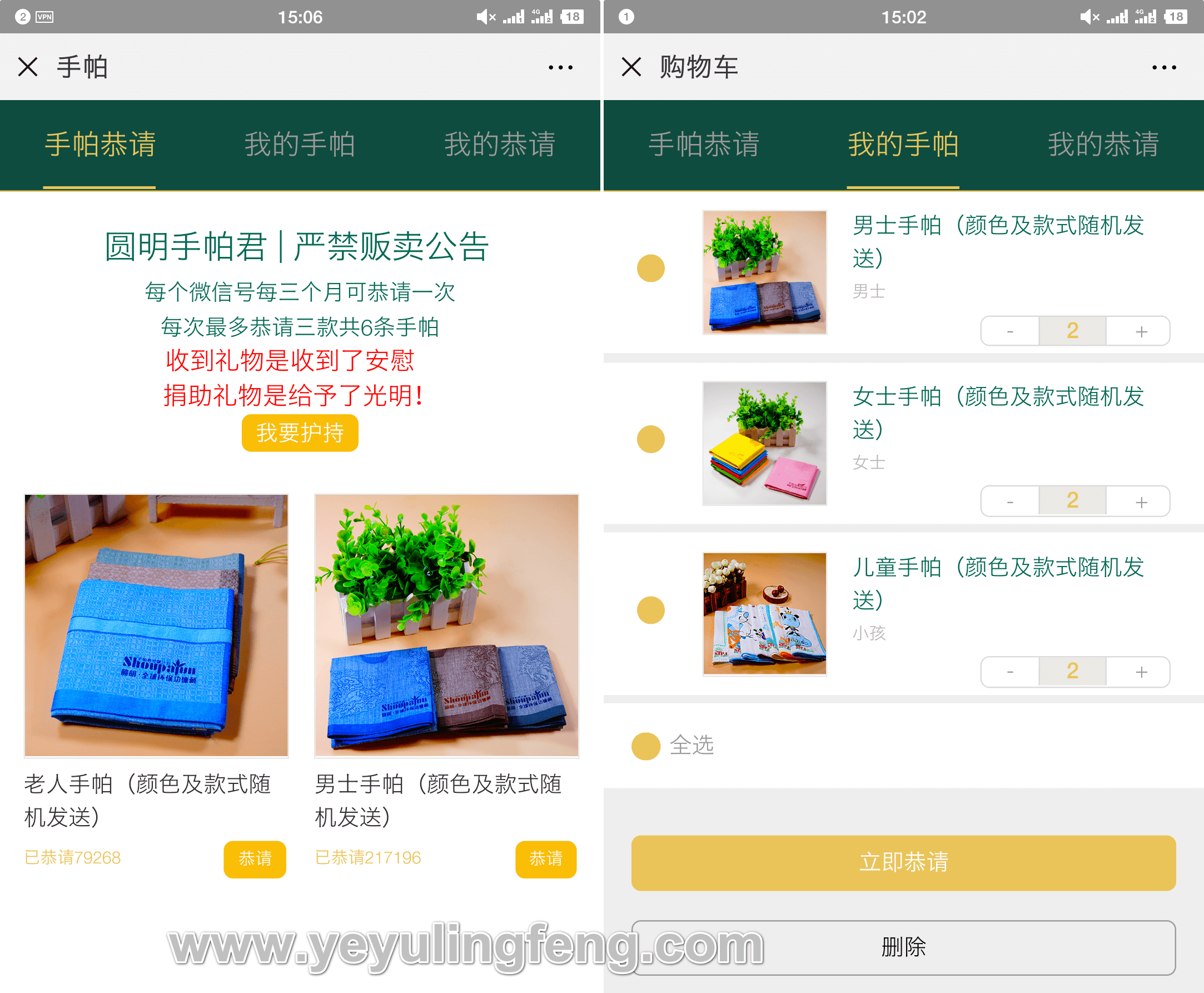 按照自己的需求挑选6条手帕,只能少不能多,加入购物车