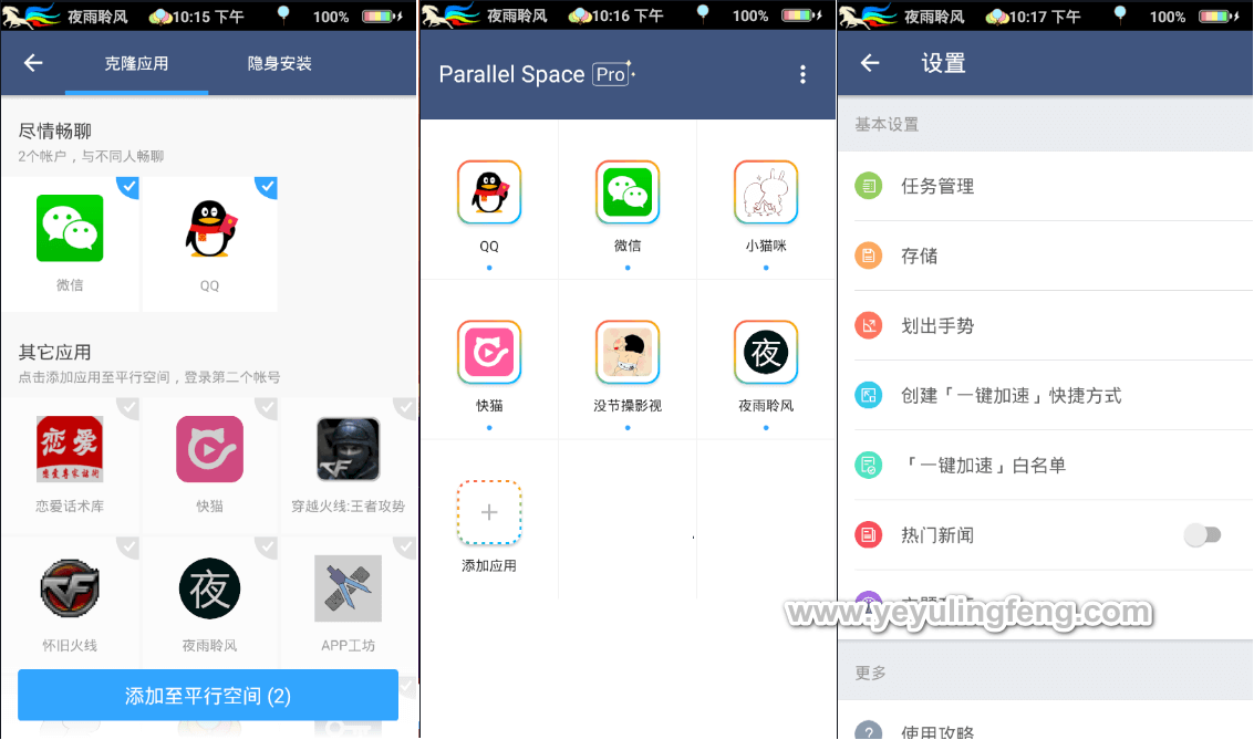 android上的应用双开工具老夜用过不少,大部分用到最后都强制更新并且加入了广告,虽然一些手机厂商已经在自家的os系统中也加入了该功能,但是只能分身QQ、微信这几个常用的应用,显然无法满足玩机党的胃口。平行空间和360的分身大师老夜都是从内测时就用上了,也见证了一个个版本的更新跌进下功能的完善。应用多开工具很多但稳定的真没几个,搞不好还会因为设备异常而封号,这里老夜还是推荐大家使用一下较出名的大厂作品,广告虽多点至少技术上还是较成熟的!