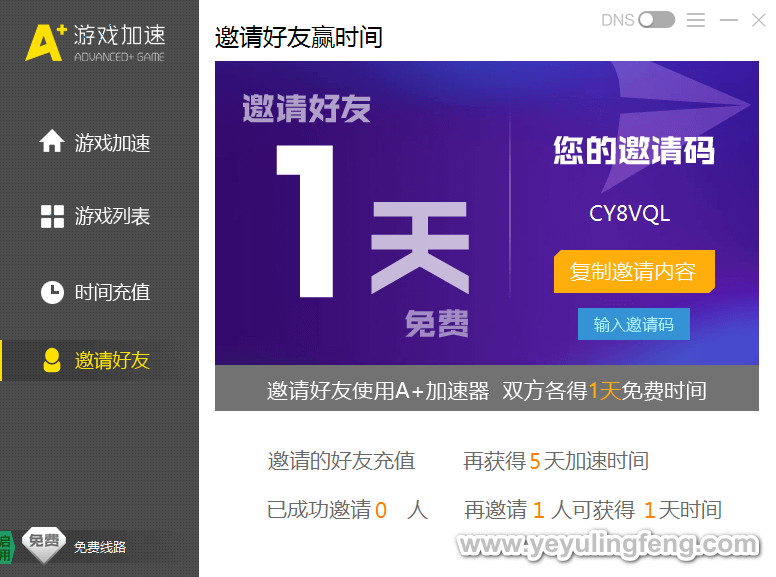 除了免费线路,新用户注册免费送一天,邀请其他用户注册也能够获得VIP体验时长。老夜的邀请码是:CY8VQL