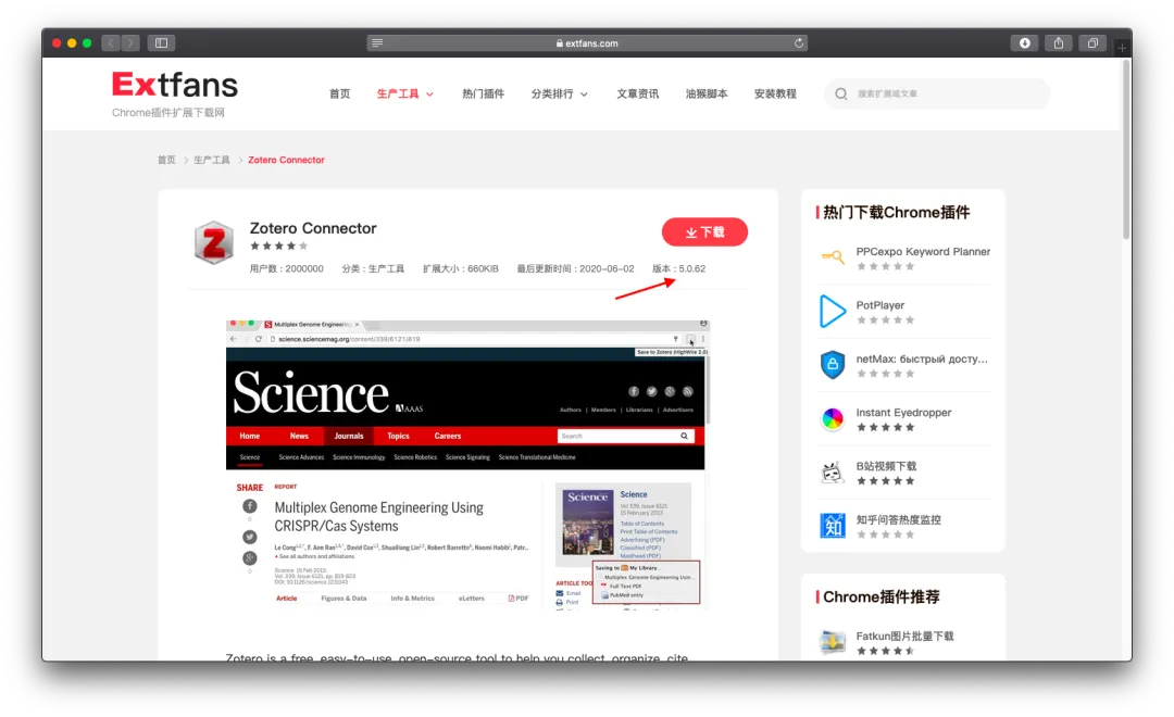 在Extfans上检索Zotero Connector后的结果如下,可以看到版本为5.0.62。