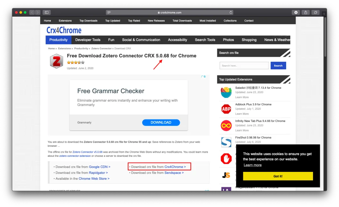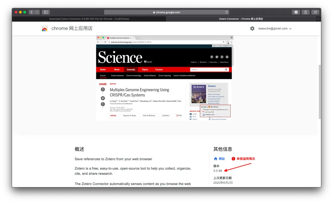 可以看到Chrome商店上Zotero Connector的最新版本同样是5.0.68,与Crx4Chrome一致。