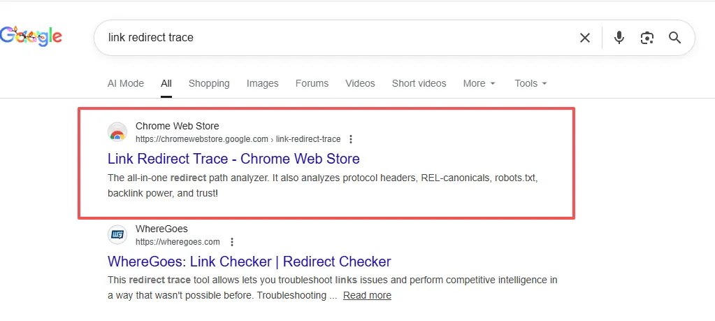 这个插件安装也非常简单,我们谷歌搜索Link Redirect Trace,第一个结果就是。