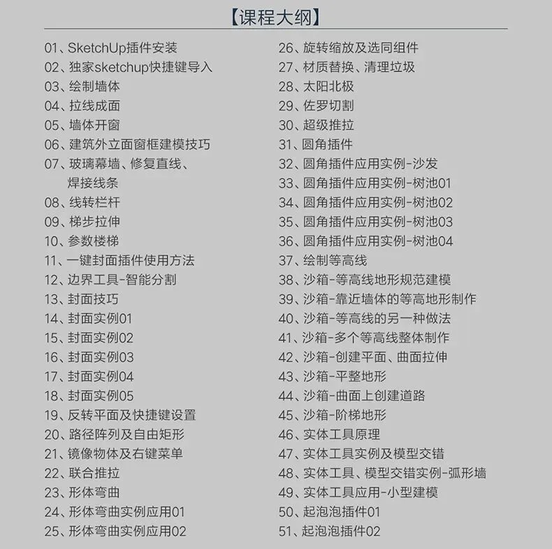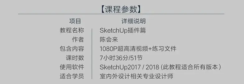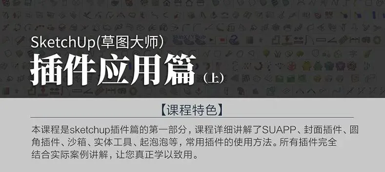 本课程是由项图云课堂推出,是Sketchup插件的实践插件应用案例讲解篇,主要为SUAPP、封面插件、圆角插件、沙箱、实体工具、起泡泡等的常用插件的使用方法与案例讲解,不同于其它只说不做或只做不说的干货,我们的课程即做又有详细讲解,让你学会之后能举一反三。