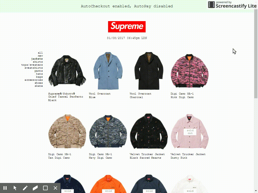 从10月30日开始,我们公布了第一个版本的Supreme官网抢购插件,经历了4周的发售以及众多热心粉丝的实战实测,无数通过我们插件抢购到心仪单品的喜讯,也得到了非常多有用的反馈,所以在年底重磅联名接踵而来之际,对插件进行一次升级。并把过去几周里遇到的问题给大家一一解释一下,请务必仔细阅读完全文每一个字,声明我们所有行为都为无偿劳动,都是参与者以及插件原作者付出时间和经历去制作,S007给予了他们精神和肉体支持。。