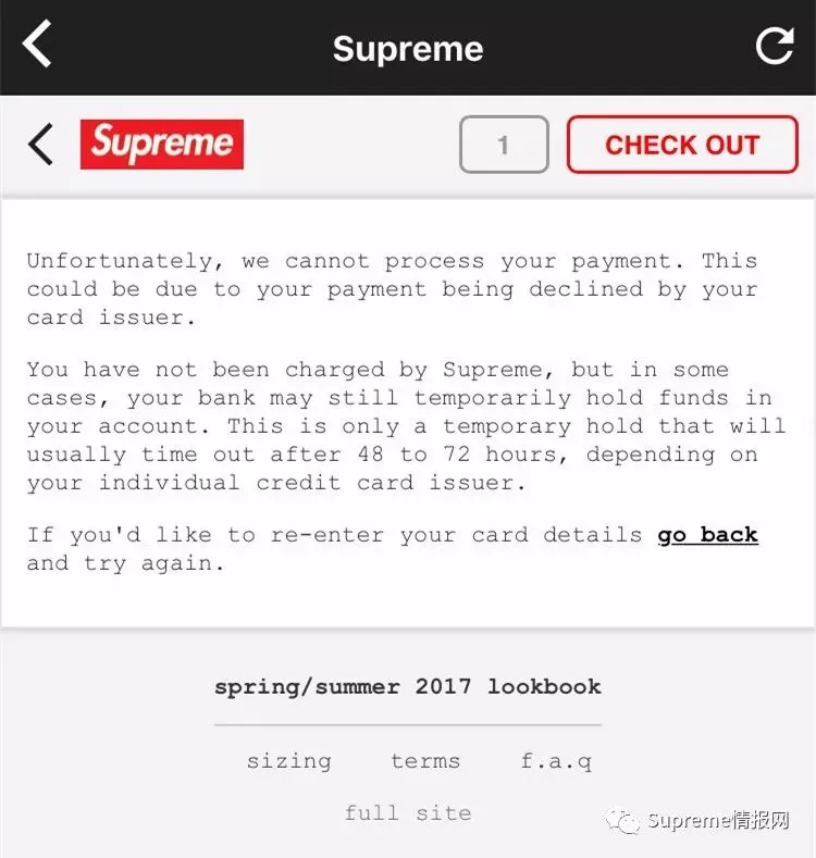 这个情况S007在everlast拳击服那一周也遇到了,我使用插件抢购豹纹拳击服,结果payment完成后提示Declined,但是手机提醒我扣了钱,一看邮箱躺着一封Supreme的order邮件,但是每过几天我就收到了发货信息。。所以,一般这个问题是个幸福的烦恼,都是Supreme系统偶尔抽风。但是东西是你的。