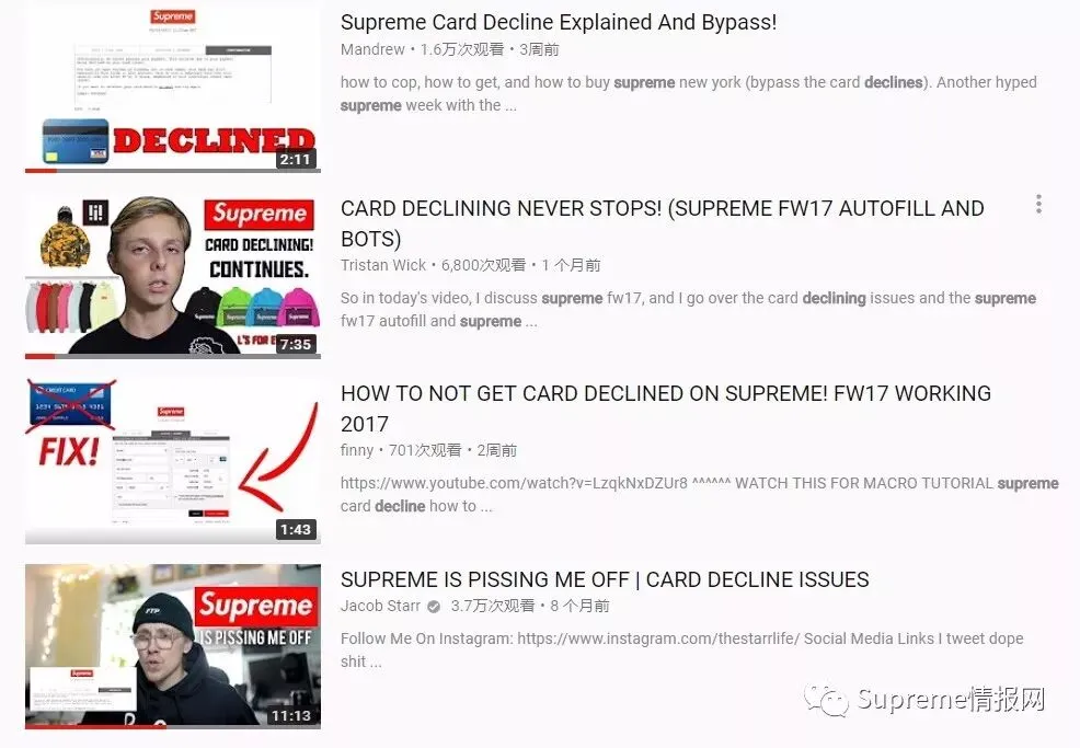 如果您手动购买就出现Card Declined,那么我们并不建议您使用插件。请您先手动尝试购买成功,再使用插件。能如虎添翼,否则什么插件都无法帮助你。借用朋友的一句话,驾照都没有,就想开GTR,还想加液氮动力?关于如何解决,请各位等待我们Supreme情报网在哔哩哔哩的第二期视频教程,同期我们会一并解答。