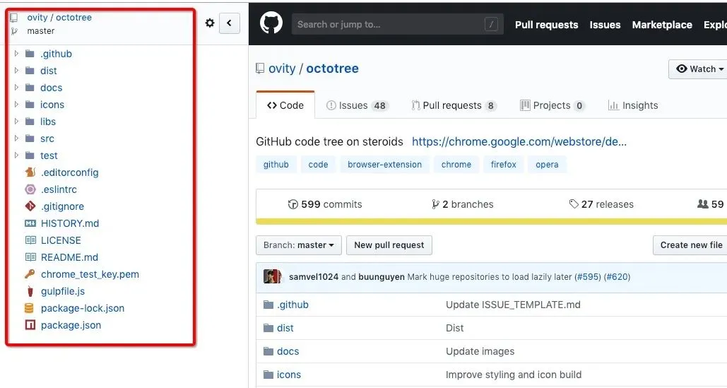 Octotree 的出现能够让 Github 体验提升到一个全新的水平,它能够以树形结构展示 Github 项目,更加易于阅读,能够快速查看某个文件,能够让 Github 像大多数 IDE 那样。