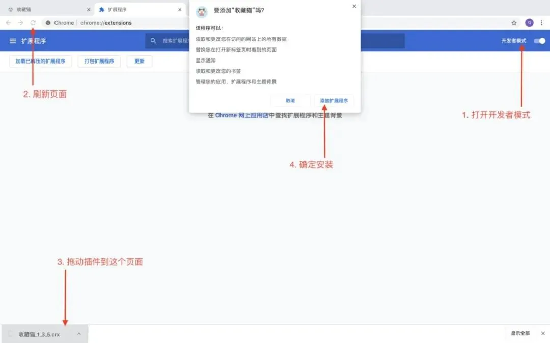 3、在扩展安装页面打开右上角的【开发者模式】按钮,然后刷新页面,将下载好的 .crx 文件拖入扩展安装页面内。
