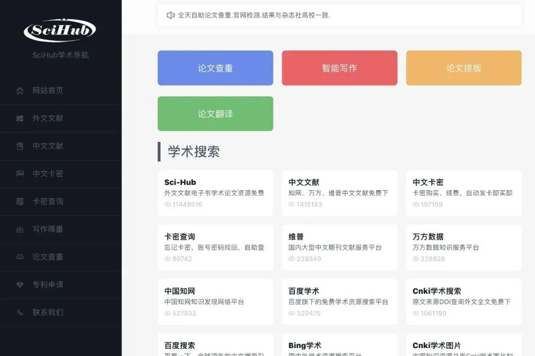 与大学毕业季一同到来的,还有令人头秃的论文写作。从论文选题,到收集资料,再拟定提纲,最后撰写论文,一个地方失误就是天坑。「SciHub」一款高效论文写作导航。网站内不仅一键直达维普、万方数据、知网、百度学术等专业期刊文献平台,还提供论文查重、论文排版、论文翻译等服务。用「SciHub」写论文真的很方便!