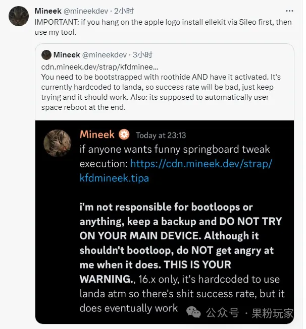 Springboard 注入工具今早被Mineek抢先首发,目前还很简陋。秀的人也一堆,卡白苹果的也不少(硬重启后一般都正常了)。最新消息,已开源,格局打开了!