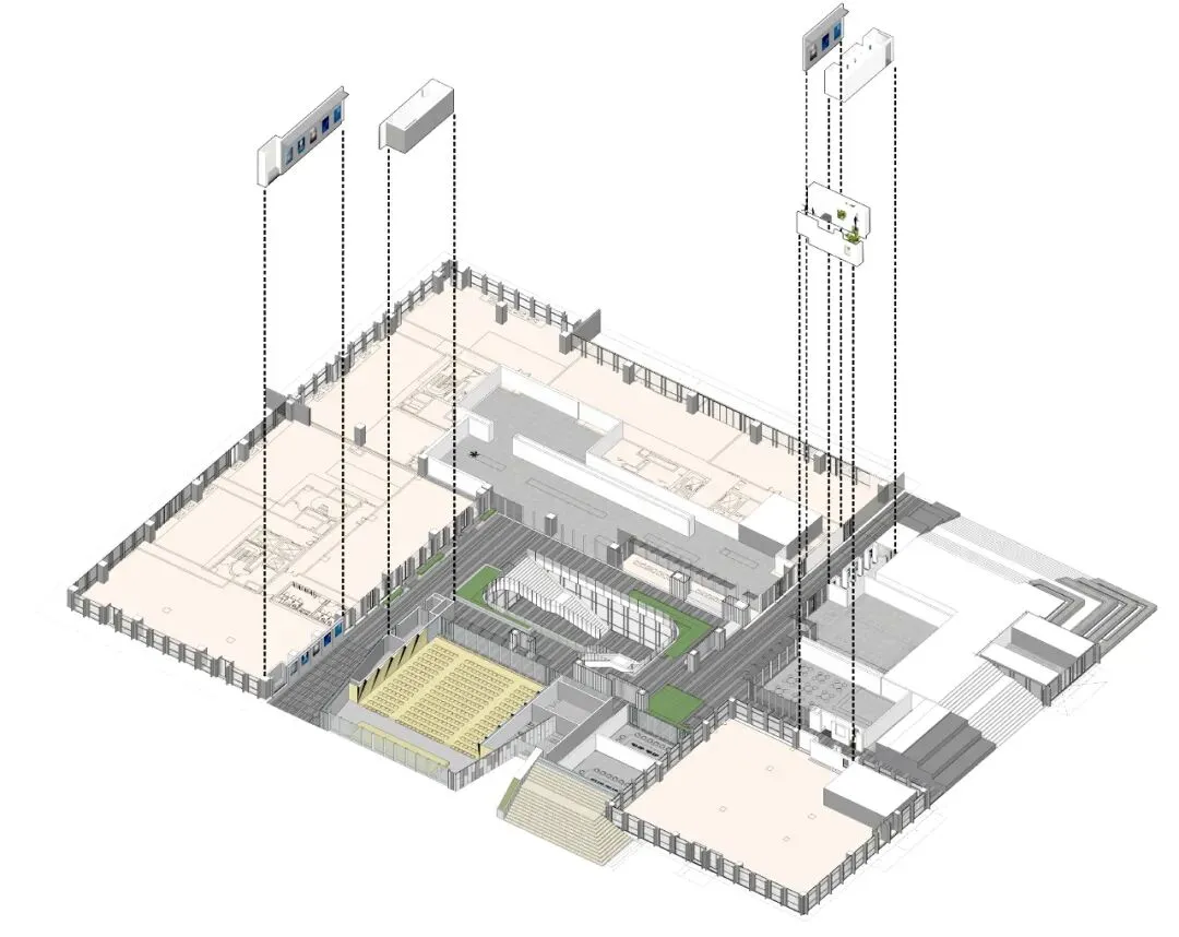 围绕会议厅的新建,建筑师通过对庭院周围的界面尺度细化来重建“工业活力核心”。在三处入口空间顺应动线,创造“厚墙”空间,利用墙面厚度碎片化置入迷你功能,为空间赋予触手可及的温度。三处入口厚墙设计了三种展陈主题,分别是北侧入口的产业时空穿梭,南侧出口的工业未来体验与东侧支路的尺园。分别对应展览流线的起点、终点和放松休息点。