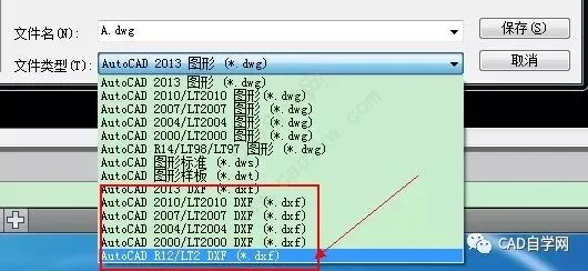 突发问题:但是有时候就是另存的DXF打不开,或者打开后软件直接崩溃。我用过的CAD版本有2004,2008,2010,2011,2012,2014。其中64位电脑安装的64位2014版本成功率比较高(32位电脑上安装的虚拟64位2014版有时成功有时崩溃),下方截图中红色方框的另存文件类型DXF均可选,最后一个一般是其他都不成功的话可以选R12的DXF操作一下。