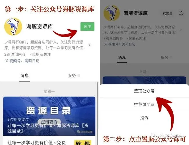 由于公众号平台更改了推送规则,如果不想要错过海豚资源库的精选学习资源以及干货文章和精品课程,记得将公众号“置顶”,这样每次都可以第一时间看到最新文章。