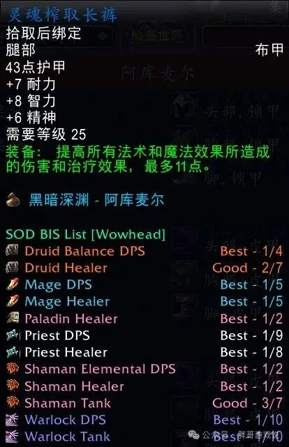 本文最后更新于2025-12-31,某些文章具有时效性,若有错误或已失效,请在下方留言或联系老夜。 魔兽探索服:P2阶段必备插件,团长使用可以解决装备纷争 窝窝头的BIS插件,P2阶段不准开金团,ROLL团最好装上这个插件,究竟是谁的BIS装备,一眼就能看出来。 不过这种插件也只是“防君子不防小人”,具体情况还需要团长自己来协调。