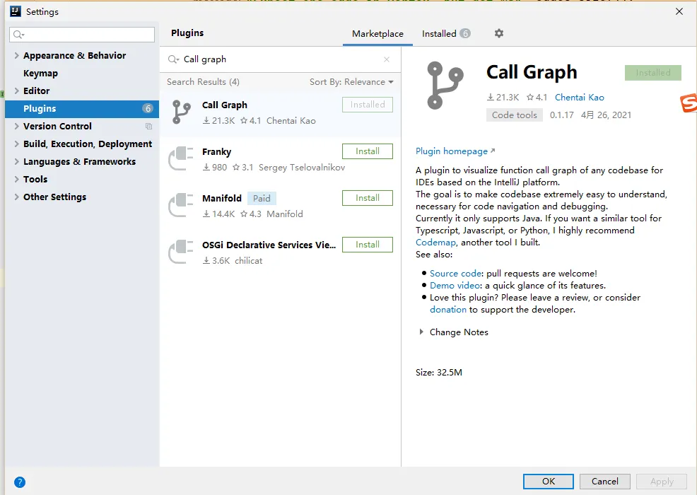 打开idea的设置-插件,搜索Call Graph,安装即可: