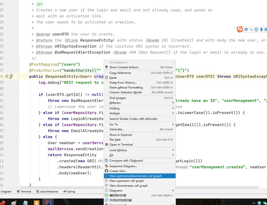 我们来看一个controller里的方法,比如UserResource的createUser。