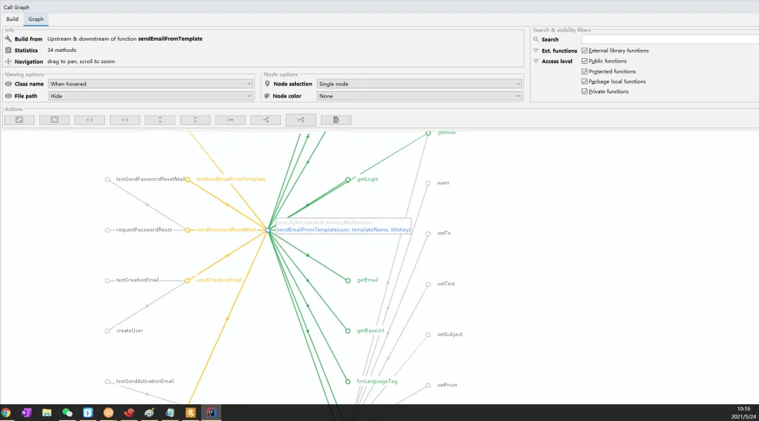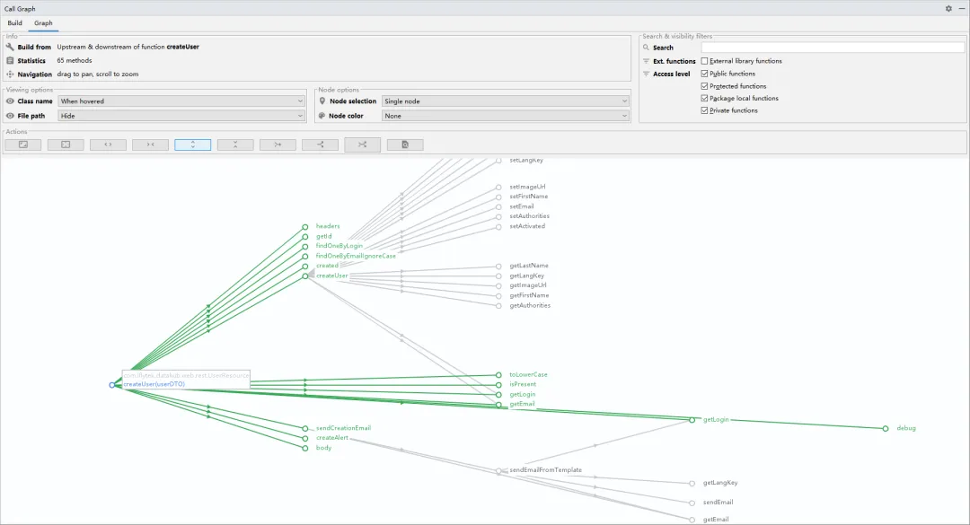 透过图形,可以很方便地看到上游有哪些函数调用了sendEmailFromTemplate,也清楚的知道sendEmailFromTemplate依赖哪些函数。