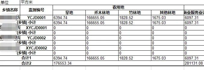 4、一键汇总各乡镇项目地块、地类面积汇总表