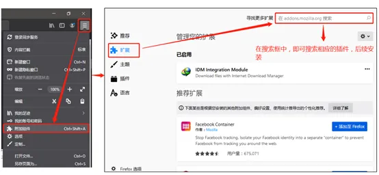 当完成以上设置后,即可进行插件的安装(直接进行,无需额外的工具)。点击“附加组件”进去,点击“扩展”,即可在上面的搜索框进行插件的搜索。