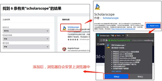 以安装Scholarscope插件为例,搜索、进入、添加到firefox、添加,过程也是简便。