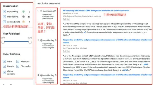 一个新兴的针对文献被引用的分析工具,将文献的被引按支持、提及和相矛盾进行分类,进而去统计各个分类中的详细被引情况,以此去呈现一篇文献的可靠程度。