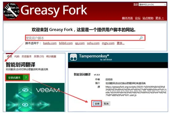 俗称油猴,是一款极为强大的插件,它的强大不在于它本身,而是它身后的脚本库。安装完成后,即可安装相应的脚本;脚本的安装方法也简单。先进入脚本库网站Greasy Fork(https://greasyfork.org/zh-CN),然后搜索脚本,安装此脚本,安装,即可搞定。
