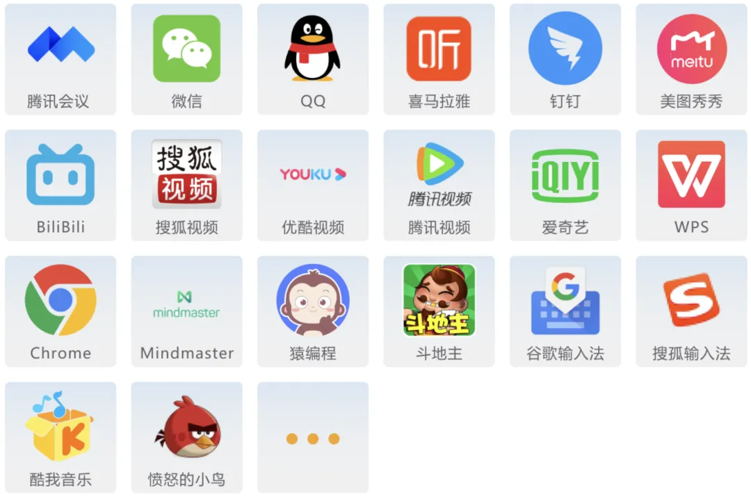 包括各类办公软件、娱乐软件、教育软件、游戏软件,比如微信、QQ、 陌陌、钉钉、WPS、腾讯会议、 Mindmaster、抖音、快手、B站、爱奇艺等等均能流畅运行。