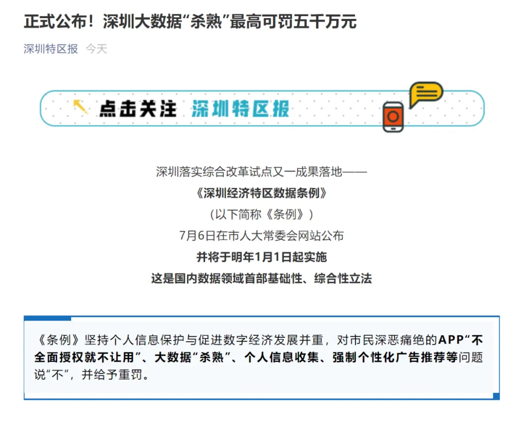 今天《深圳经济特区数据条例》正式发布,将于明年1月1日起实施,这也是国内数据领域首部具雏形、综合性立法。